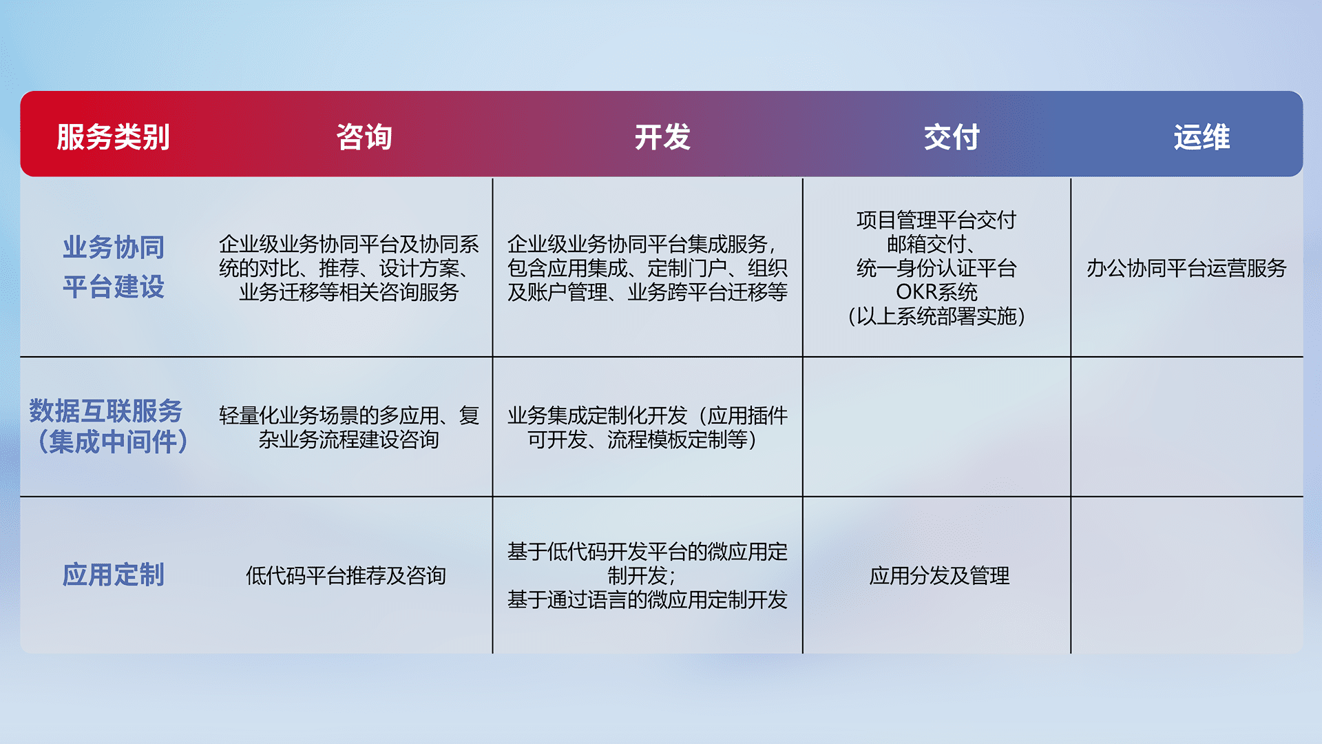 针对钉钉、、企微、、、IDaas等平台级产品提供产品的规划、、、方案、、交付、、、、定制化开发等服务,,,,实现如统一协同办公、、、智能客户服务、、、、混合会议管理、、智能数据查询、、、等业务场景,,,实现数字化转型。。