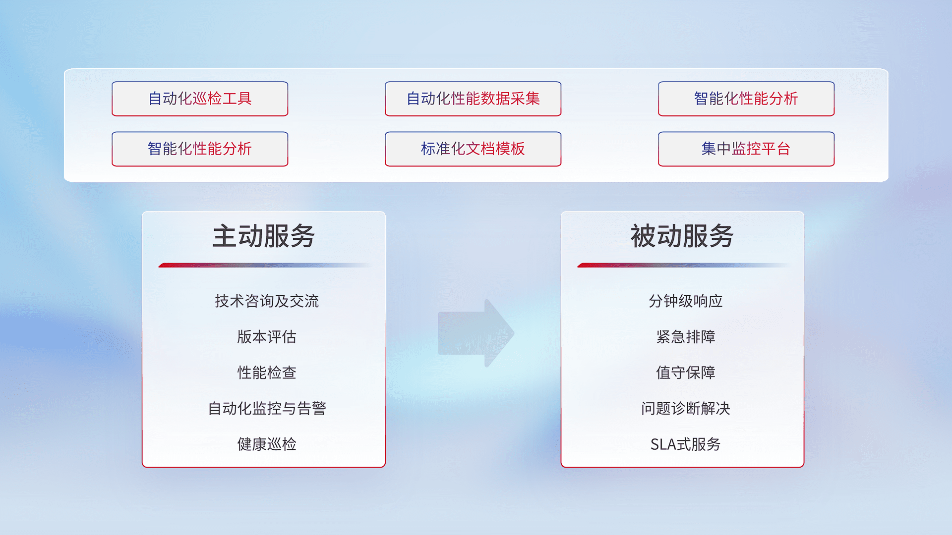 智能化工具和标准化文档,,,保障服务质量,,提供主动服务(包含技术咨询、、版本评估、、性能检查、、、自动化监控与告警、、、健康巡检)和被动服务包含(分钟级响应、、、、紧急排障、、、、值守保障、、、问题诊断解决、、、SLA服务)。。。